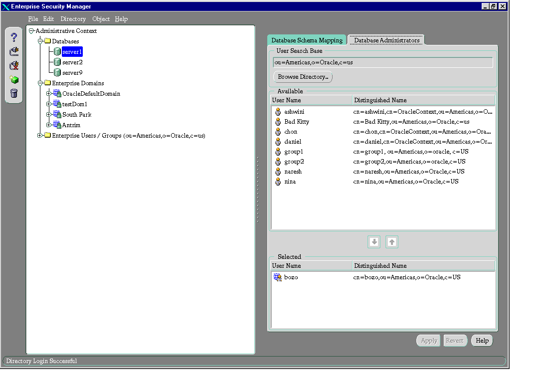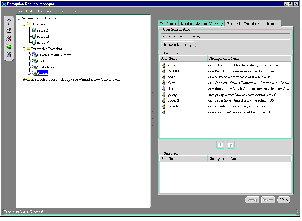 - Select the Database Administrators tab. The Available window displays user names of enterprise users available in the current user search base.