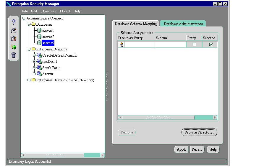 - Click Apply. The database object is updated in the directory, and an empty row is added in the Schema Assignments window should you want to add more mappings.