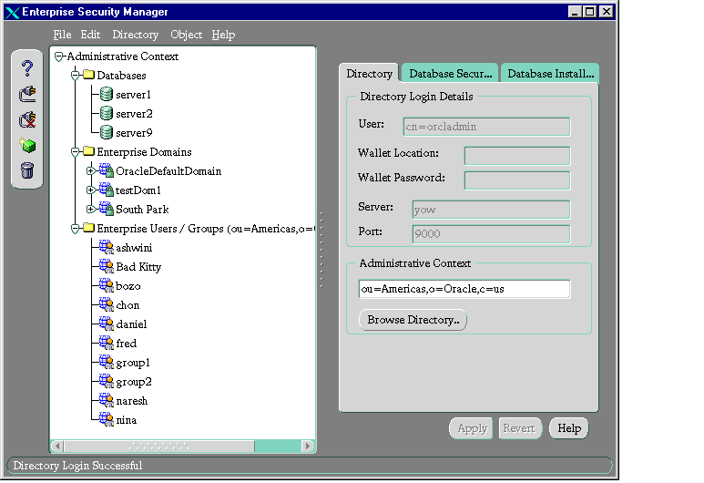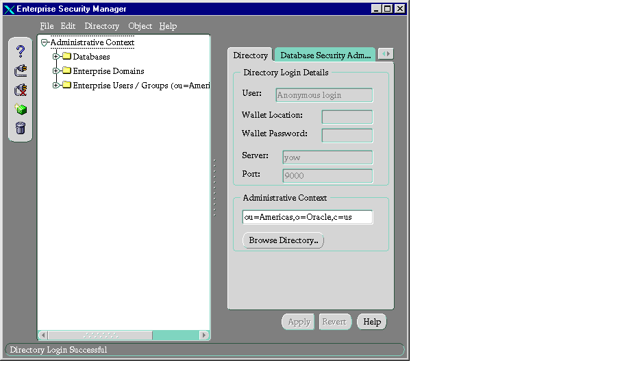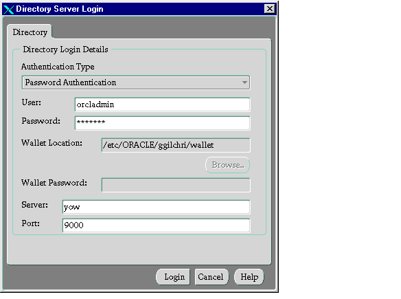 - From the Oracle Enterprise Security Manager menu bar, choose Directory > Login.