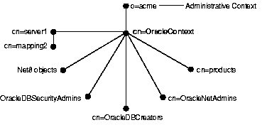 With Oracle8i Release 8.1.6, as we will see later in this chapter, you choose one or more naming contexts to contain Oracle enterprise information. We call these administrative contexts, and in each one, a container may be created to hold Oracle enterprise information. This container is called an Oracle Context.