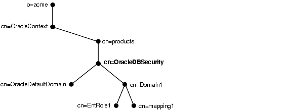 The Oracle Context also contains the database security subtree under the cn=products and cn=OracleDBSecurity container objects. This subtree contains enterprise domains, which are the groups of database servers and enterprise roles.
