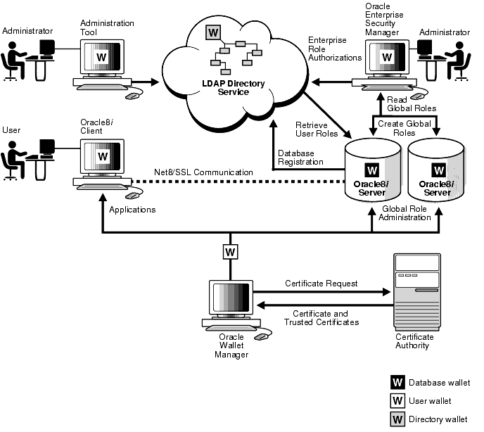 This section summarizes the interactions between the various components in enterprise user security management. In this summary, we are assuming that the user already has a wallet and that the user's authentication to the database takes place by using SSL.