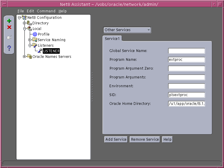 extproc in the Program Name field, a SID, such as plsextproc, in the SID field, and the Oracle home where the extproc executable resides in the Oracle Home field,