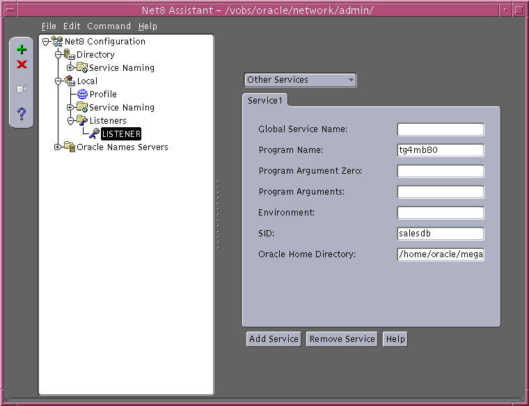 sid_list_listener= (sid_list= (sid_desc= (sid_name=salesdb) (oracle_home=/home/oracle/megabase/8.1.6) (program=tg4mb80)))
