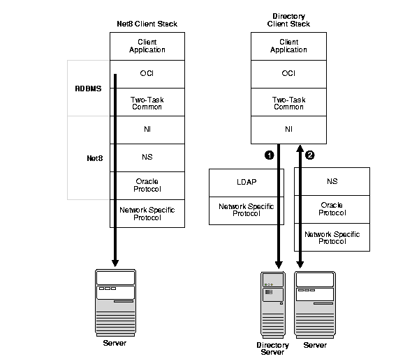 Clients that access a LDAP-compliant directory server go through an additional LDAP layer to connect to the directory, as shown in Figure 3-3. The directory sends the information back to the client through the traditional client stack.