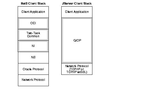 EJB and CORBA clients use a different communication stack than a typical Net8 client stack, as shown in Figure 3-6. Differences include: