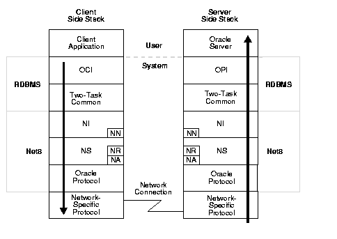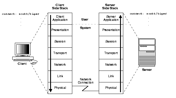 Figure 3-2 shows a client-server communications stack in an Oracle networking environment.