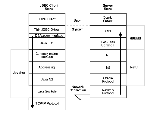 The JDBC/OCI client stack is similar to a typical Net8 Client stack. The Thin JDBC client stack has similar components implemented differently. In a Java client applet-server transaction, information passes through the following layers:
