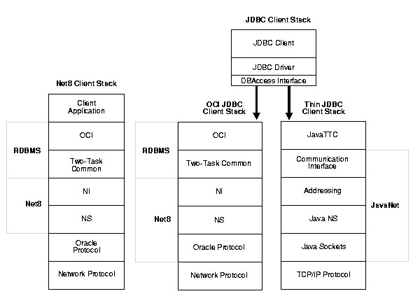 The Java DBAccess Interface layer enables the client to initiate a SQL session much like Oracle Call Interface (OCI) does in a standard client communication stack.