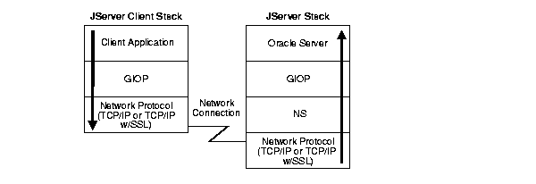 The server side does not require many of the Net8 communication layers needed in a typical Net8 connection. Instead, the server side only requires a network protocol of TCP/IP and an Oracle protocol of TCP/IP or TCP/IP with SSL. The only component of Net8 required is Network Session (NS). Figure 3-7 shows a communication stack between a client and the Oracle8i JServer option in the Oracle database.