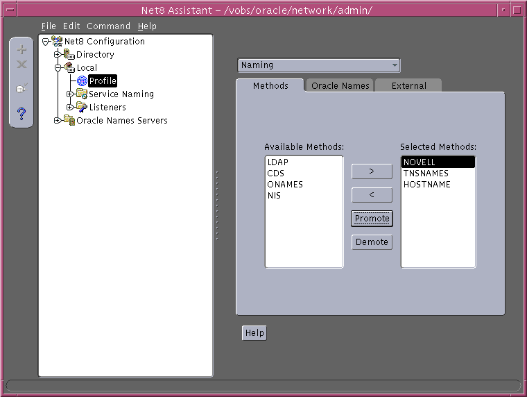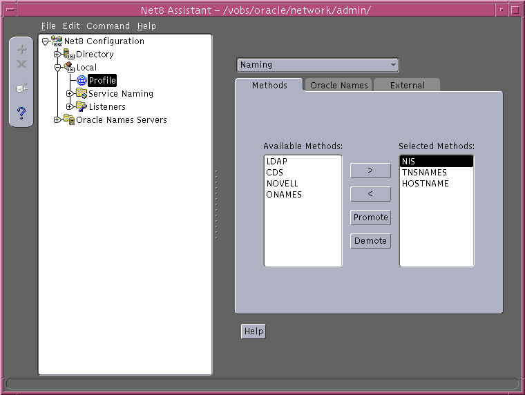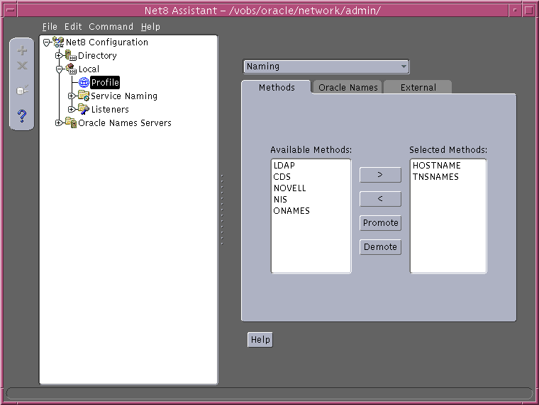 Net8 Configuration Assistant prompts you to select naming methods to use. If Local is selected, Net8 Configuration Assistant prompts you to configure net service names in a tnsnames.ora file to connect to an Oracle database services.
