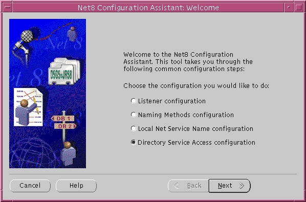 After a Custom installation on the server, Net8 Configuration Assistant prompts you to configure access to a directory. Directory access configuration enables: