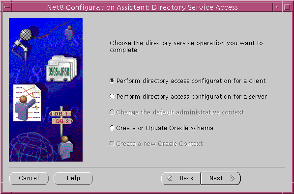 In addition, Net8 Configuration Assistant verifies that the Oracle schema was installed. If an Oracle Context or the Oracle schema was not configured by the server, you cannot complete directory access configuration on the client.
