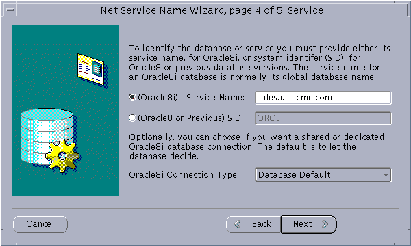 If the destination service is Oracle release 8.1, click (Oracle8i), and enter a service name in the Service Name field. If destination service is Oracle release 8.0 or version 7 database, click (Oracle8 or Previous), and enter an Oracle System Identifier for an instance in the Database SID field.