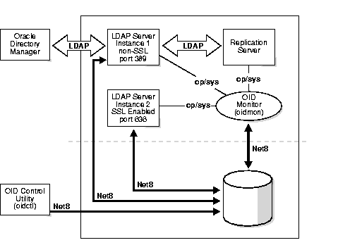The replication server uses LDAP to communicate with an LDAP server instance. To communicate with the database, all components use OCI/Net8. Oracle Directory Manager and the command line tools communicate with the Oracle Internet Directory (LDAP) servers over LDAP.