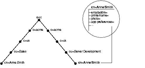 In Figure 2-1, the entry for Anne Smith in Great Britain has several attributes, each providing specific information about her. These are listed in the balloon to the right of the tree, and they include emailaddrs=, printername=, jpegPhoto=, and app preferences=. Moreover, each bullet in Figure 2-1 is also an entry with attributes, although the attributes for each are not shown.