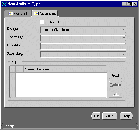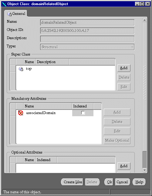 Object classes from which attributes may be inherited are listed in the Super Class pane. The mandatory attributes are listed in the Mandatory Attributes window and optional attributes are listed in the Optional Attributes window. Each window indicates whether the attributes are indexed so that they can be used in a search expression.
