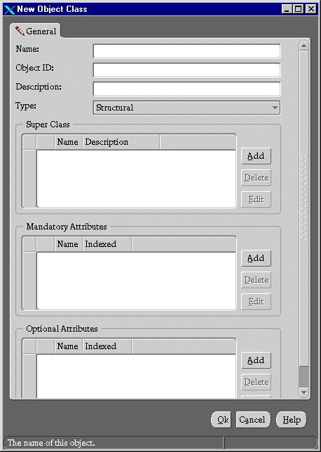 To examine an individual object class and its attributes, select the Object Classes tab and double-click the object class in the list displayed in the panel. The properties of the selected object class appear in the Object Class dialog box: