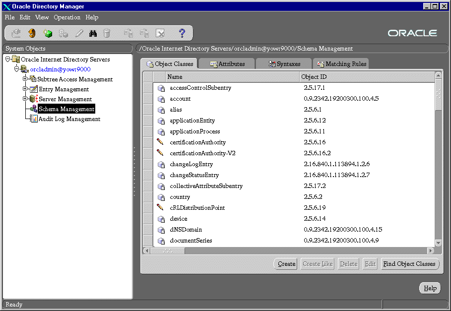 Listed below are the types of modifications you can make to an existing object class. The rules for these modifications are explained later in this section. You can perform any modifications through Oracle Directory Manager and through the command line tools.