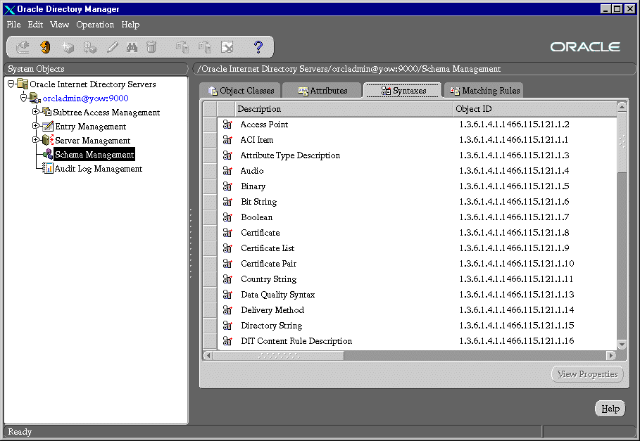 You can find a given syntax Object ID by using either Oracle Directory Manager or the ldapsearch command line tool.