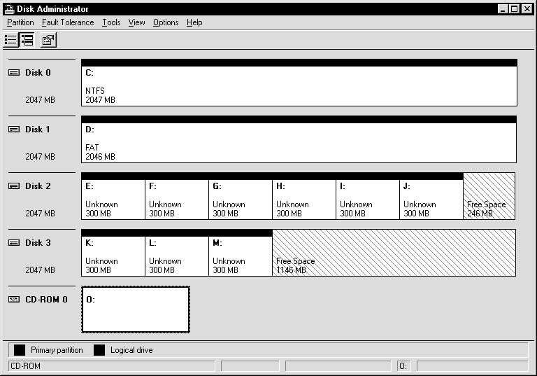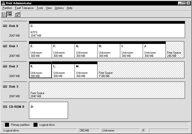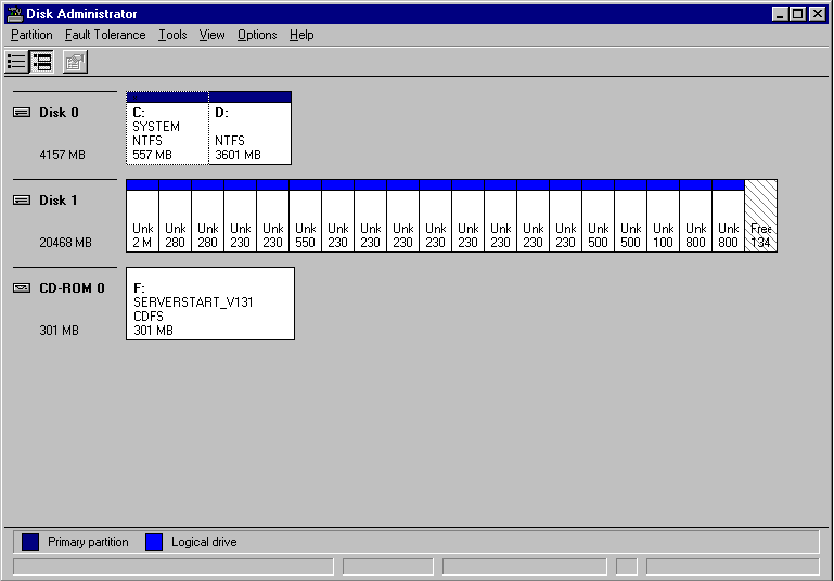 An extended partition with nineteen logical partitions and 134 MB of free space (this disk device includes six physical disk drives) |