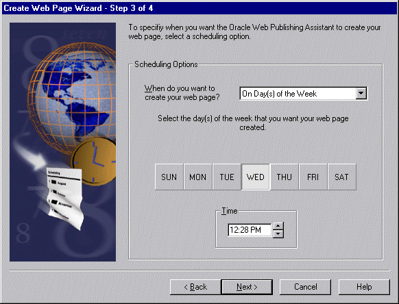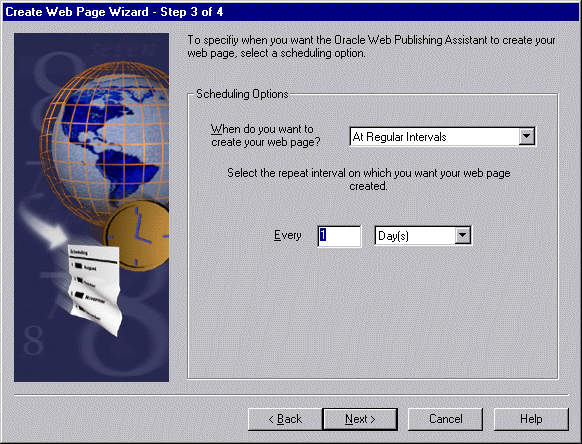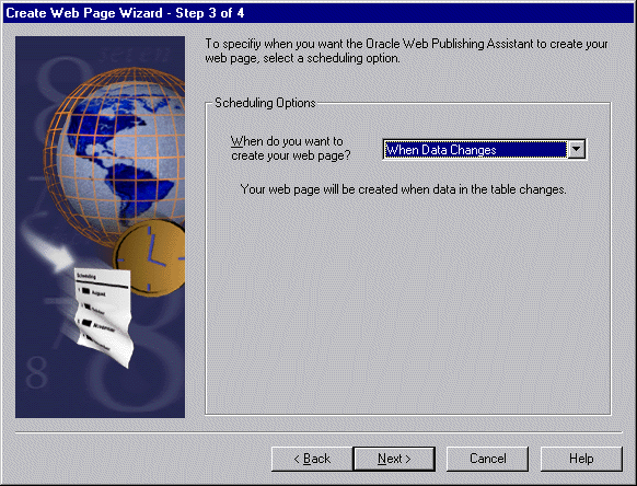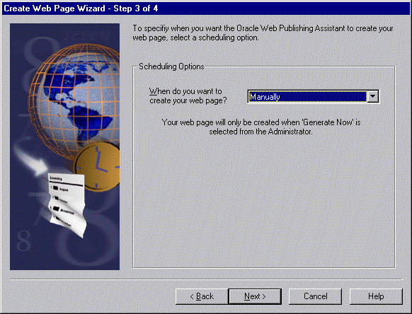 Due to the asynchronous processing model used by Oracle Web Publishing Assistant, it is possible that your scheduled Web page query has not yet been generated. If it has not been generated, Oracle Web Publishing Assistant asks if you want to generate it now.