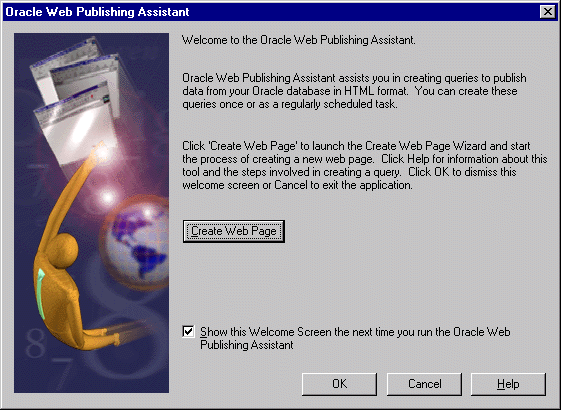If you do not want the welcome screen to appear the next time you start the Oracle Web Publishing Assistant, clear the check box on the bottom of the welcome screen.