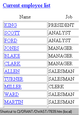 Note that when you pass the mouse pointer over the employee name, an HTML file is linked to the name. The file each employee name points to is what you will be creating in the next section, such as EMP#HTM, where EMP# is the employee number. After you complete the next section, the result will be a file EXAMPLE3.HTM which incorporates the files MAIN.HTM and EMP#.HTM.
