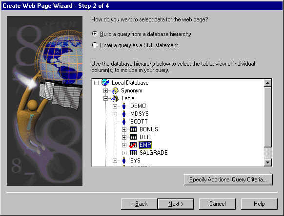 The second tutorial queries the SCOTT.EMP table (installed automatically when you install Oracle8 using the Typical Installation Option) and formats the retrieved information using the template EXAMPLE2.HTX.