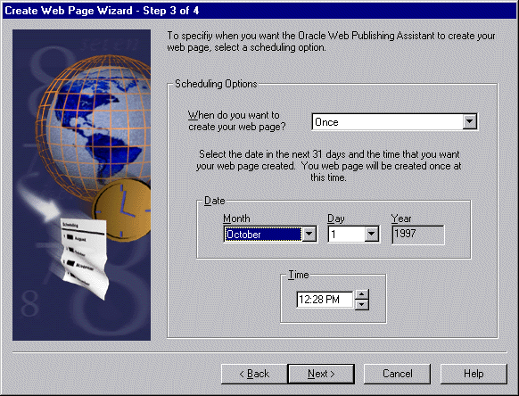 Oracle Web Publishing Assistant appears. If you have never created a Web page query using the Create Web Page Wizard before or if you do not have any Web page queries scheduled in the listing, then the welcome screen appears with a Create Web Page button. To bypass the welcome screen upon subsequent use of Oracle Web Publishing Assistant, clear the check box on the screen.