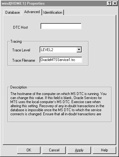 The Oracle Service for MTS includes an Advanced tab in the Properties dialog box that enables you to modify the following information: