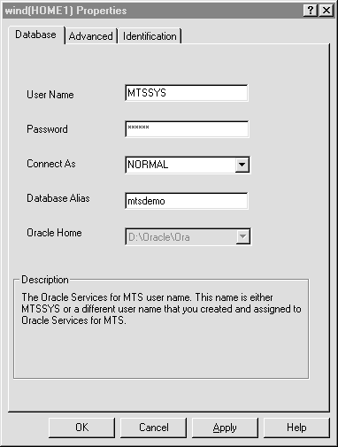 The Oracle Service for MTS includes a Database tab in the Properties dialog box that enables you to modify the net service name, Oracle home, user name, and password of an existing Oracle Service for MTS.
