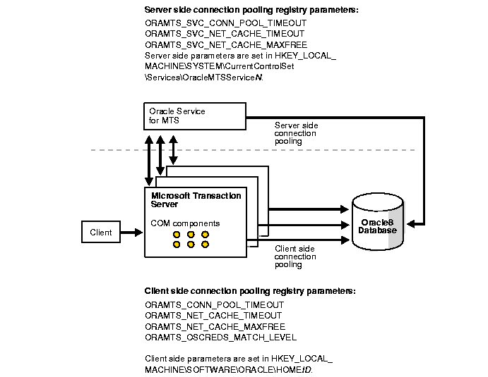 The idle period during which a connection can be reused reduces the resource costs associated with opening a new connection. The amount of time that the connection remains idle and available in the connection pool is determined by several registry parameter settings that you can modify on the computers on which the client Microsoft Transaction Server components and the Oracle Service for MTS are installed. The Oracle Service for MTS uses a similar connection pool. The connection pool is located in two places: