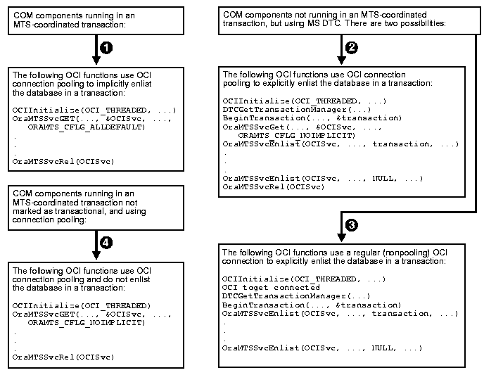 If you use OraMTSSvcGet() and OraMTSSvcRel(), and you did not register your component to run in a Microsoft Transaction Server transaction, you can still enlist your database in a Microsoft Transaction Server-coordinated transaction. Use OCI function OraMTSSvcEnlist() (for pooled or nonpooled connections) or, for better performance, OraMTSSvcEnlistEx() (for nonpooled connections obtained through standard OCI methods). In these cases, the MS DTC component of Microsoft Transaction Server coordinates the transaction. See sections "OraMTSSvcEnlist()" and "OraMTSSvcEnlistEx()" for more information.