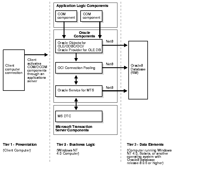 This section describes how OCI connection pooling, Microsoft Transaction Server, and MS DTC operate with application components in this type of environment.