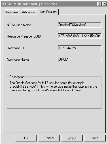 The Oracle Manager for MTS Services snap-in includes an Identification tab in the Oracle Service for MTS Properties dialog box that enables you to view information that can be useful when debugging problems with Oracle Support Services. Note that none of the information in the Identification tab can be changed.