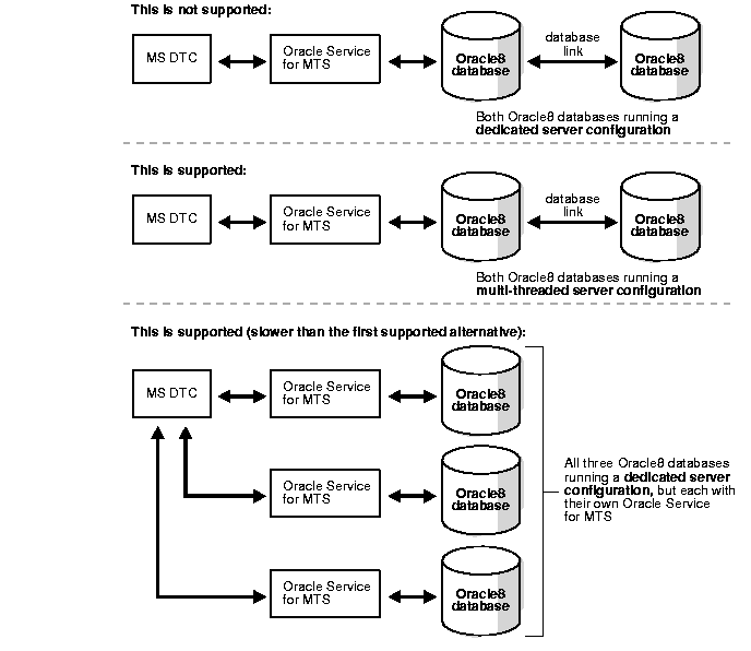 Oracle Service for MTS does not support the use of database links between Oracle8 databases running in dedicated server configurations. As alternatives, the Oracle Service for MTS supports using database links in a multi-threaded server environment or providing each Oracle8 database with its own Oracle Service for MTS in a dedicated server environment. This figure illustrates these alternatives: