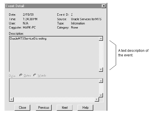 Oracle Service for MTS problems and other significant occurrences are recorded as events. These events are recorded in an application event log. View and manage these recorded events in the Event Viewer. The types of events displayed include: