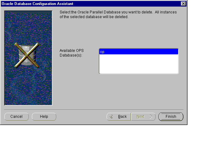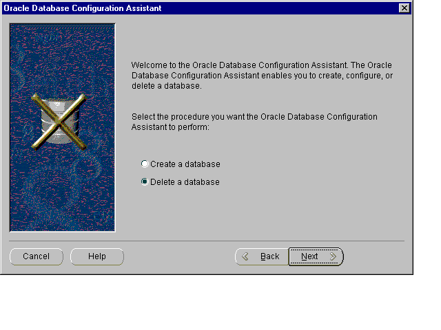 The Delete a Database option of Oracle Database Configuration Assistant lets you quickly and easily delete a database. Deleting a database removes its initialization parameter files, instances, OFA structure, and operating system configuration. Data files are not removed from the raw partitions.