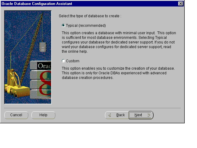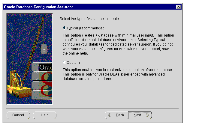 If you chose a Typical installation type, Net8 Configuration Assistant and Oracle Database Configuration Assistant run after software installation with no user input. Oracle Database Configuration Assistant creates a starter database and adds necessary information to the network configuration. During database creation, Oracle Database Configuration Assistant verifies that the raw devices were created for each tablespace. Raw devices should have been configured in "Setting Up Raw Devices". If the raw devices are not set up properly, Oracle Database Configuration Assistant fails to create the database.