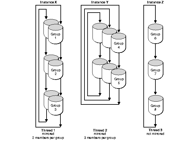 Different instances of Oracle Parallel Server can have different degrees of mirroring, or different numbers of members per group. The different instances can also have different numbers of groups. For example, one instance could have three groups with two members per group, a second instance could have four non-multiplexed log files, and a third instance could have two groups with four members per group. While such a configuration may be inconvenient to administer, it may be necessary to achieve the full potential of the system.