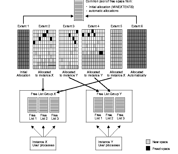 When Oracle allocates new extents to a table, Oracle adds their blocks to the master free list. This can eventually result in contention for free space among multiple instances on Oracle Parallel Server because the free space contained in newly allocated extents cannot be reallocated to any group of free lists. You can have more control over free space if you specifically allocate extents to instances; in this way you minimize free space contention.