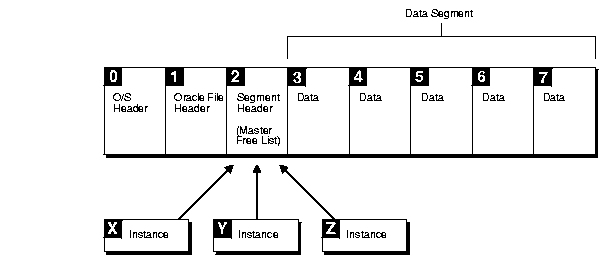 Figure 7-4 shows the blocks of a file in which the master free list is stored in the segment header block. Three instances are forced to read this block to obtain free space. Because there is only one free list, there is only one insertion point. Free list groups help reduce contention by spreading this insertion point over multiple blocks, each of which will be accessed less frequently.