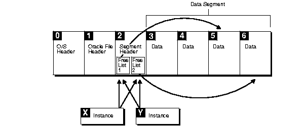 If multiple free lists reside in a single block in an Oracle Parallel Server environment, the block with the free lists could thus experience pinging, or forced reads/writes among all the instances. Avoid this by grouping the free lists into separate groups and assigning each group to an instance. Each instance then has its own block containing free lists. Since each instance uses its own free lists, there is no contention among instances to access the same block containing free lists.