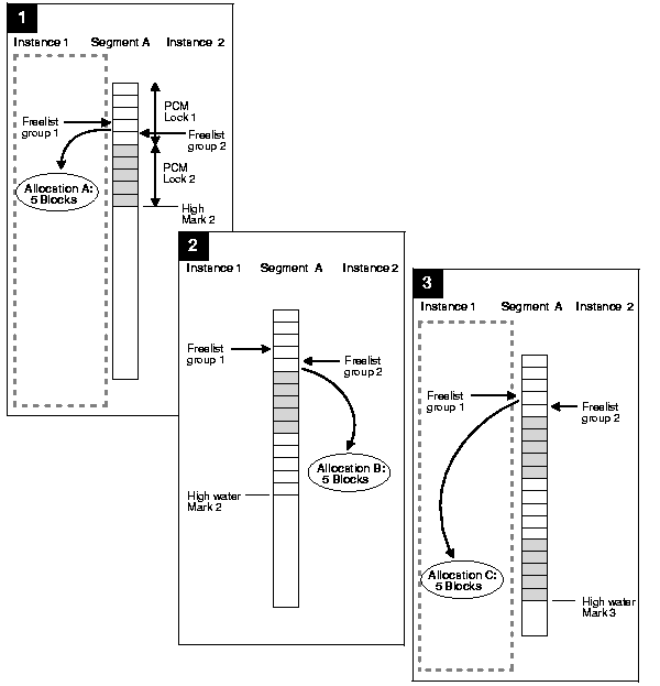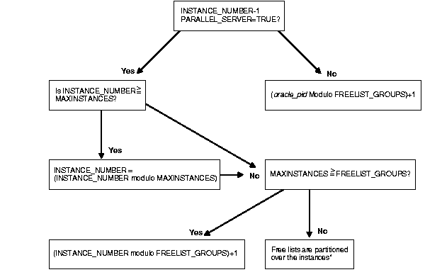 The actual free list group block is determined by hashing the Oracle process ID by the number of free list groups. For example, if there are 3 instances and 35 free list groups, then instance 1 handles the first twelve free list groups, instance 2 the next twelve, and instance 3 the remaining eleven.