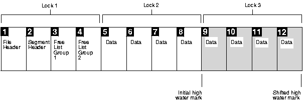 When a row is inserted into a table and new extents need to be allocated, a certain number of contiguous blocks, as specified by !blocks in the GC_FILES_TO_LOCKS parameter, is allocated to the free list group associated with an instance. Extents allocated when the table or cluster is first created and new extents that are automatically allocated, add their blocks to the master free list or to the space above the high water mark.