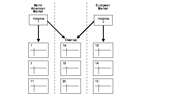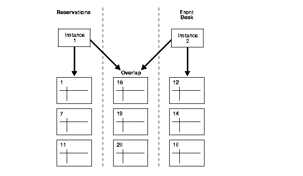 For one type of departmental partitioning, separate the tables by access groups based on geographic location. For example, assume the hotel reservation system processes room requests for hotels around the world. In this case, you might partition the application by geographic markets such as:
