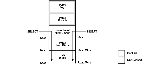 For example, Figure A-1 illustrates read and write access to data in a large table in which two levels of the index are not in the buffer cache and only a high level index is cached in the System Global Area.
