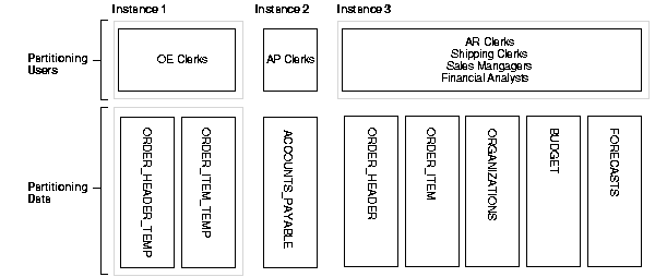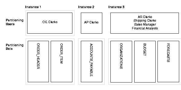 You can set up your system as shown in Figure A-3 with all order entry clerks on one instance to minimize contention for exclusive PCM locks on the tables. This allows sales managers and financial analysts to get up-to-the-minute information. Since they do want data that is predominantly historical, there should not be too much contention for current records.