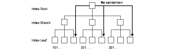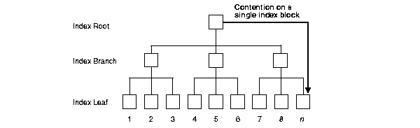 When multiple instances concurrently insert rows into a table having an index, contention for index blocks decreases performance unless index values can be separated by instance. Figure 8-1 illustrates a situation where all instances are trying to insert into the same index leaf block (n).